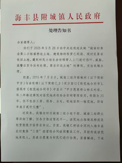 针对此事,河雅墘村第二小组所在的附城镇曾出具《处理告知书》,其中有“我镇向时任城南二组小组干部、城南二组群众等详细了解,但各方陈述情况不一,该荒地出租情况特别是租黄期限方面存在争议”等内容,同时也承诺“我镇已将该合同列入海丰县农村集体“三资”经营性合同挂图整改工作,另经约谈该荒地承租人,其表示愿意与村民们进行协商,妥善解决,下来我镇将推进双方协商并监督指导城南二组依法依规按有关程序进行整改。”