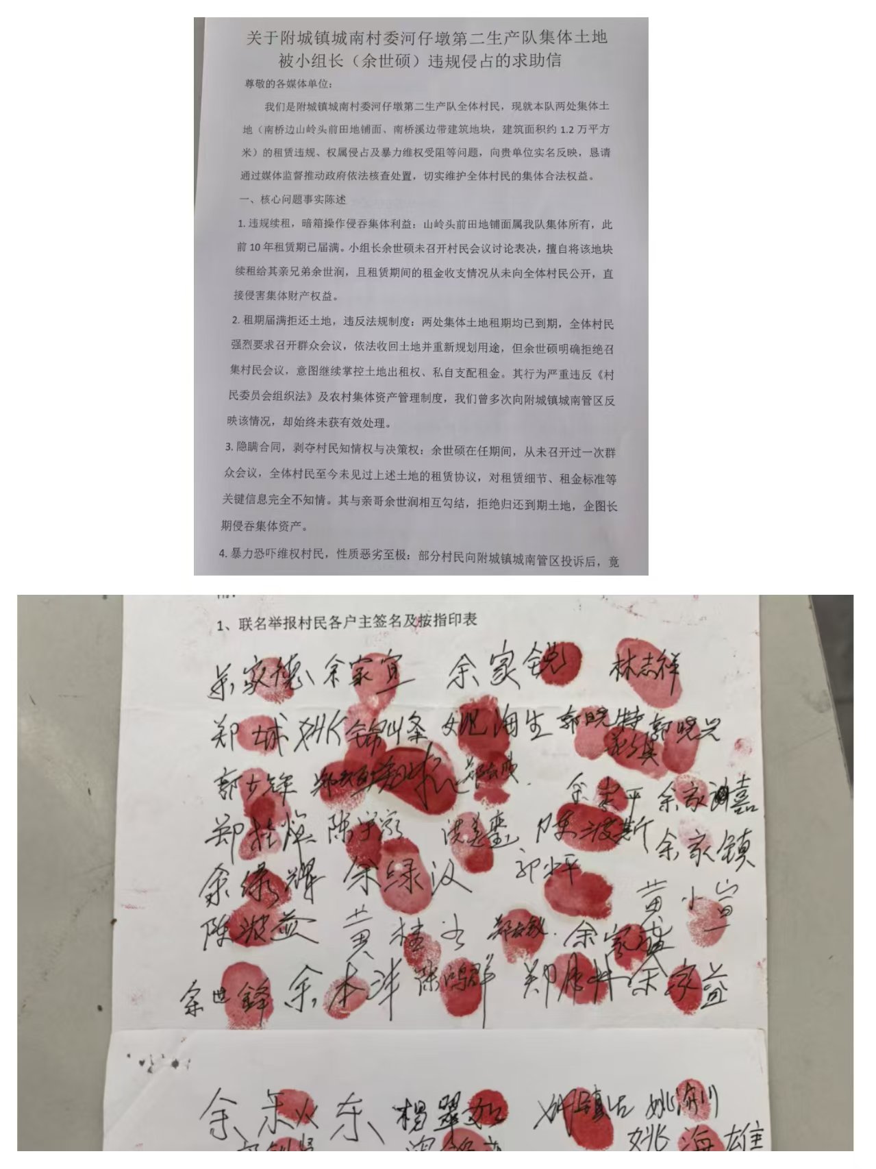 因为长期被以余世硕为首的家族势力“绑架”,村小组多数村民忍无可忍,纷纷选择站出来,具名写下给社会各界的《求助信》,其中表明“村小组长余世硕长期以家族势力为依托,有形成黑恶性质团伙的嫌疑,其行为严重侵害村集体与村民合法权益。其中有余世硕滥用职权隐瞒集体资产处置的情况;还有余疑通过非法手段当选小组长,其兄弟余世捷、余世鹏同步当选村民代表,形成家族势力把控基层事务的情况。由此希望上级有关部门介入事件调查,责令余世润停止对村小组“山岭头前田地铺面”及“南桥溪边带建筑地块”的侵占,将两处集体土地归还我队;并且及时公开两处土地租赁期间的全部租金收支明细,对侵占的集体资产予以追缴返;同时依法核查余世硕的当选程序及任职期间的违纪违法行为,追究其相关责任。